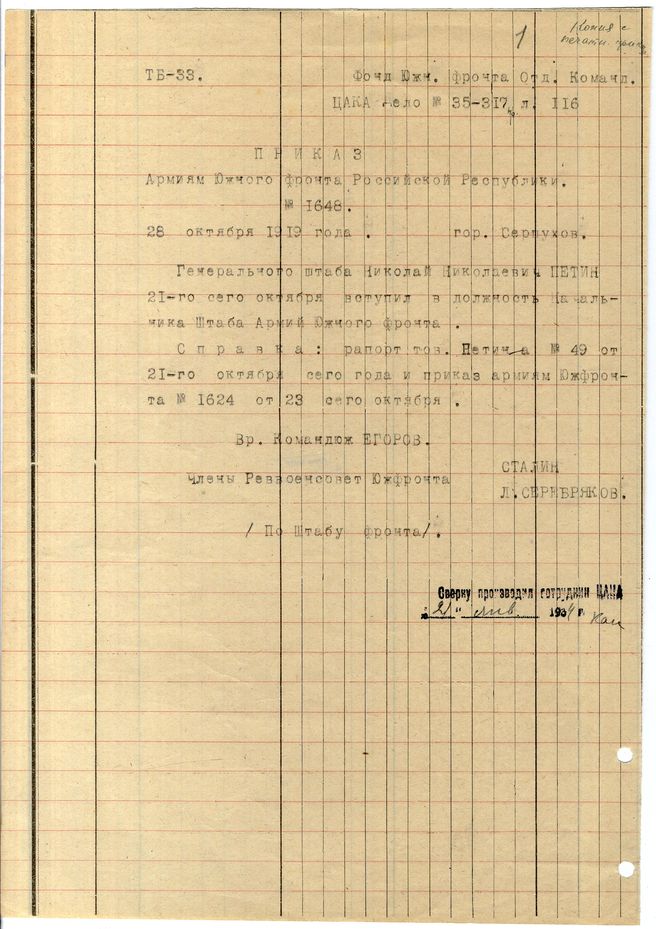 Аннотация | Приказ № 1648 Революционного военного совета Южного фронта армиям фронта о вступлении Петина Н.Н. в должность начальника штаба фронта. Подписи: Сталин, Егорова, Серебряков. |