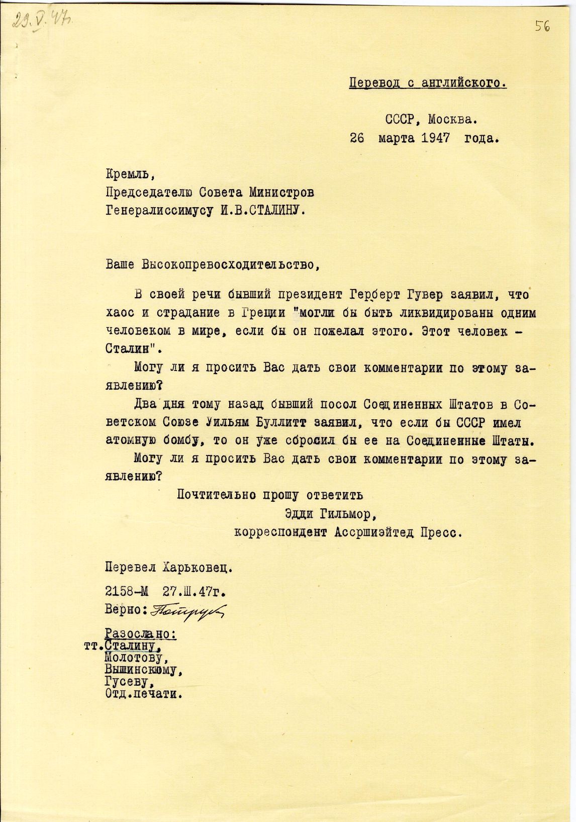 док.30: Письмо корреспондента Ассошиэйтед Пресс Гильмора Э. на имя Сталина И.В. с просьбой дать комментарии заявлениям Гувера о Греции и Буллита об атомной бомбе.