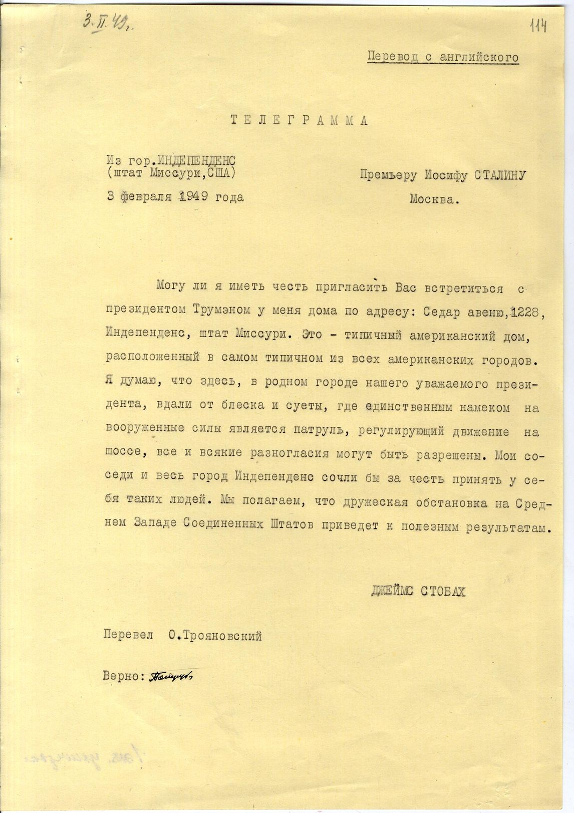 док.46: Телеграмма из Индепенденса (США) от Собаха с приглашением Сталина И.В. встретиться с Трумэном у него в доме.