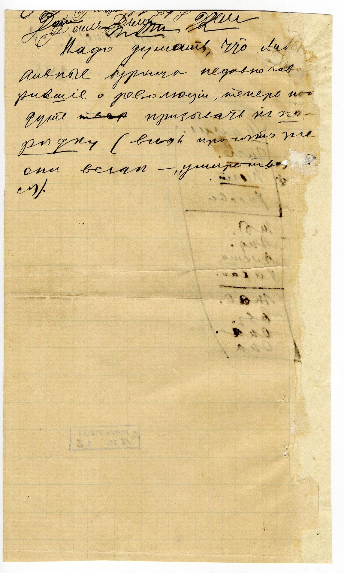 СТАЛИН И.В. Отрывок текста: «Надо думать, что либеральные буржуа недавно говорившие о революции теперь пойдут призывать к порядку (ведь просят же они всегда «умиротвориться») и список имен и псевдонимов. Имеется пометка полицейского чиновника. [Октябрь 19