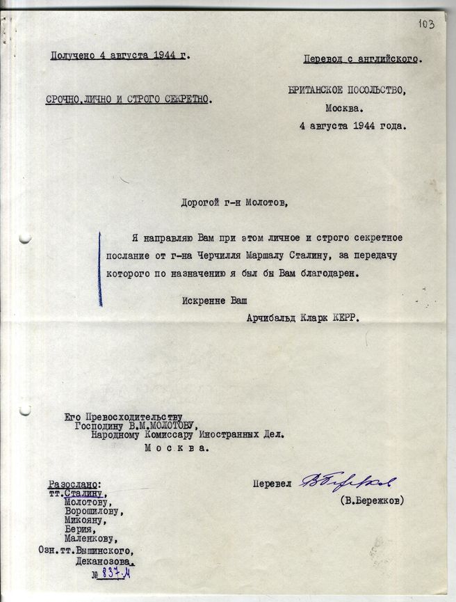 док.23: Письмо Керра А. Молотову В.М. с текстом послания Черчилля У. Сталину И.В. о предоставлении Советскому Союзу английских подводных лодок для действия в Балтийском море.