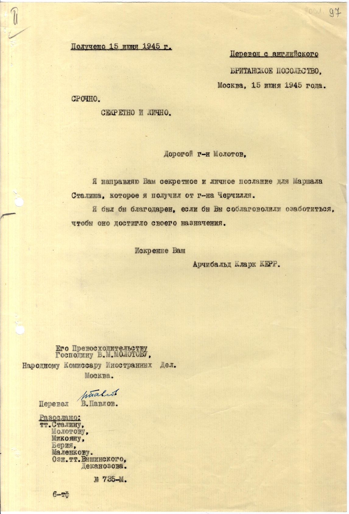 док.25: Письмо Керра А. Молотову В.М. с текстом послания Черчилля У. Сталину И.В. об отводе войск в соответствующие оккупационные зоны, о вводе гарнизонов в Берлин.