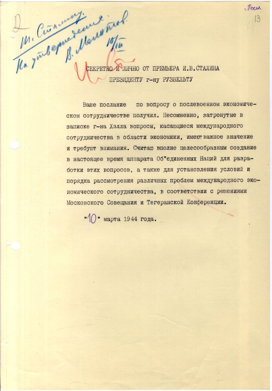 док.5а: Подлинник послания Сталина И.В. Рузвельту Ф.