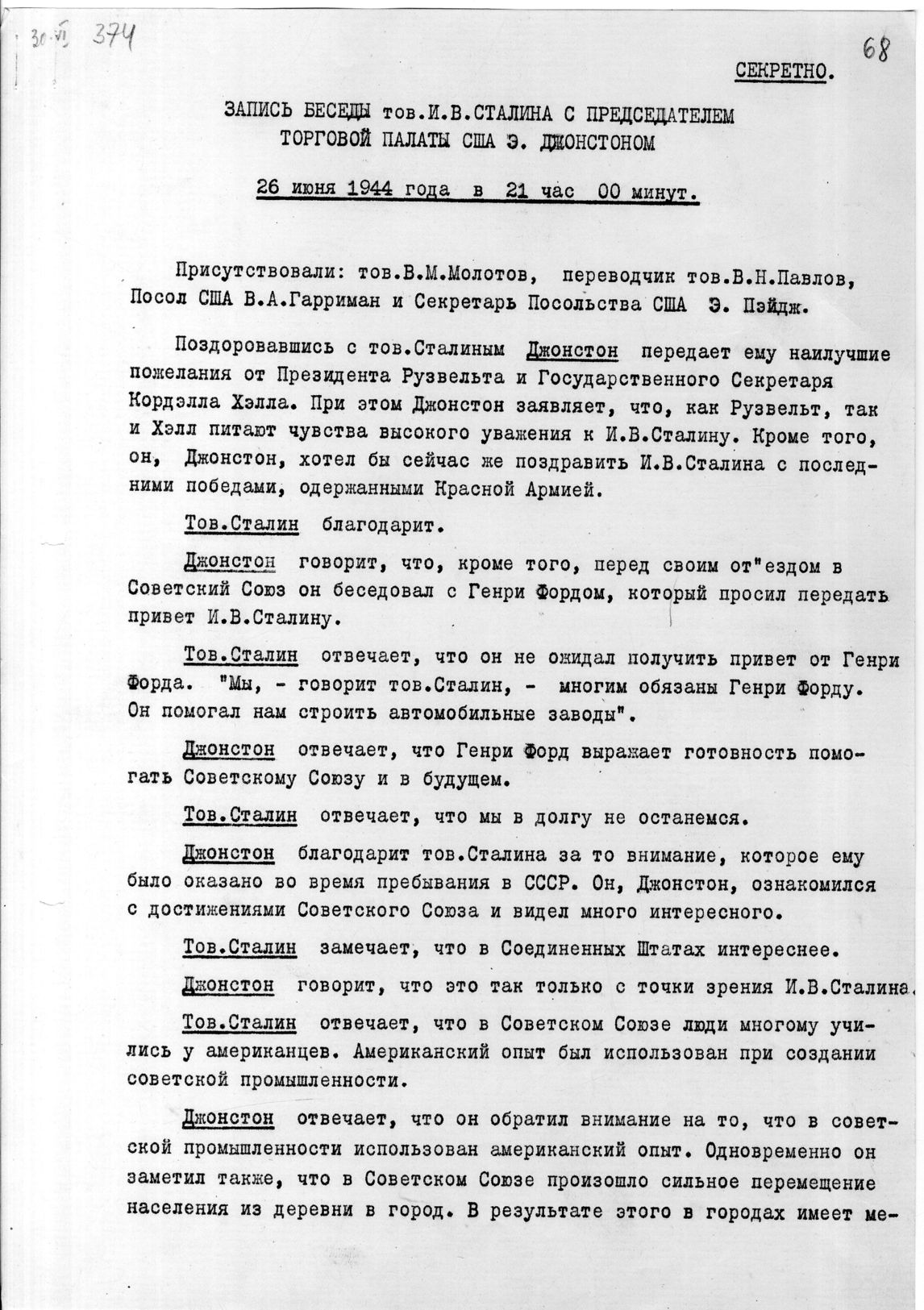 Документ 20. док.20: Запись беседы Сталина И.В. с Джонсоном Э.