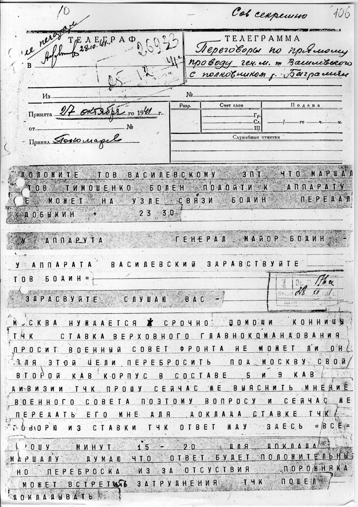 док.21: Переговоры Василевского А.М. с Бодиным Н.И. о переброске 2-го кавкорпуса под Москву в распоряжение Ставки.