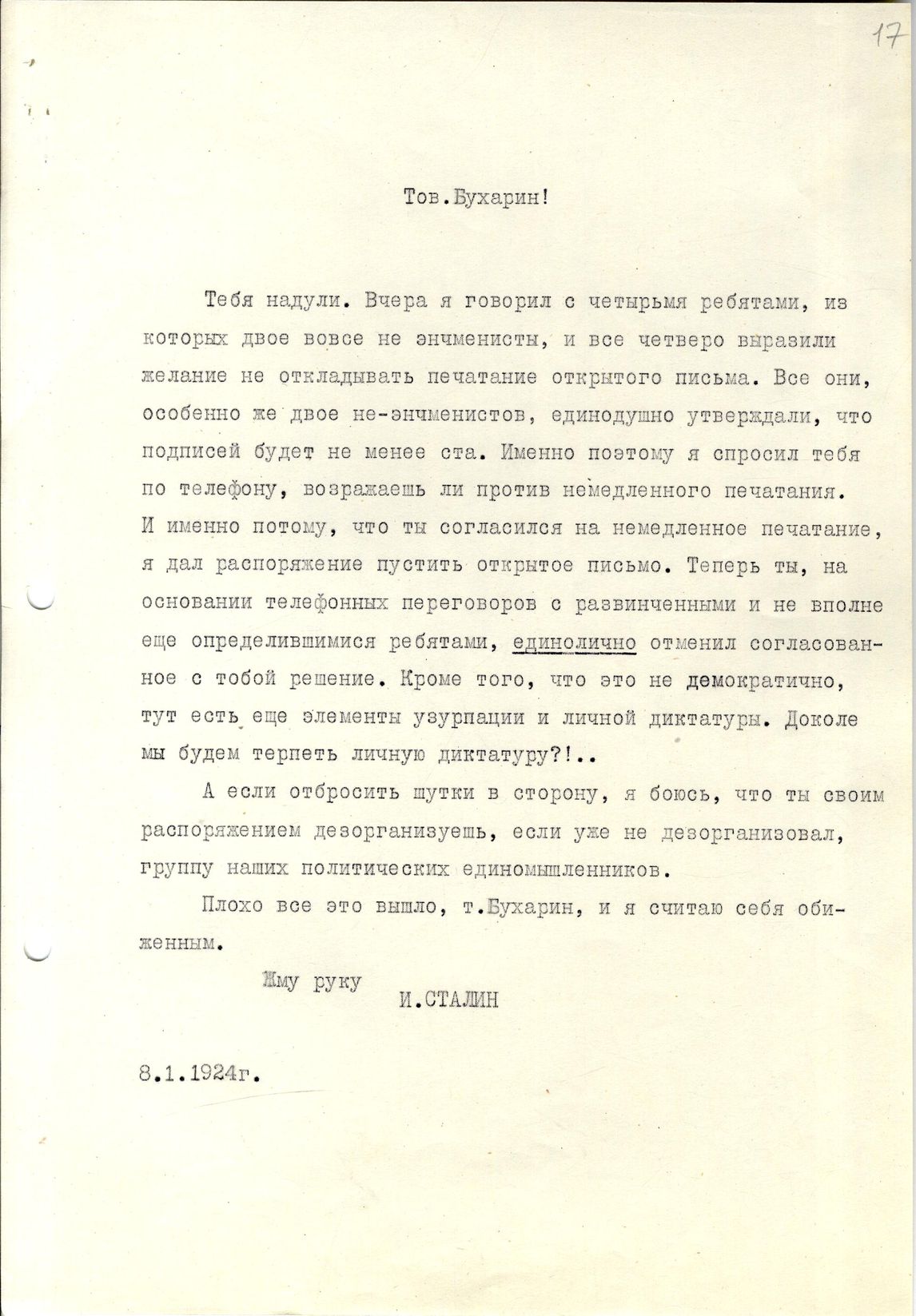 док.12: Письмо Сталина И.В. об отмене Бухариным Н.И. распоряжения о печати открытого письма.