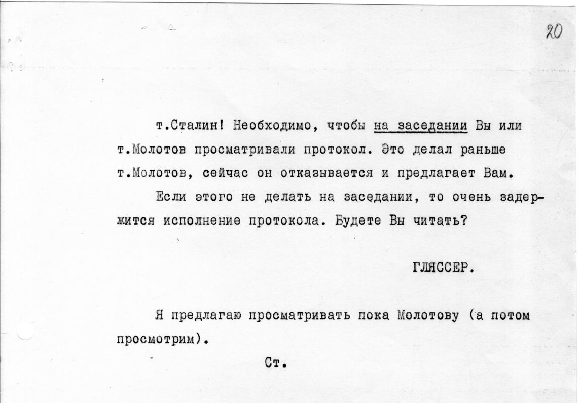 док.8: Записка Гляссер М.И. с предложением сразу просматривать протокол прошедшего заседания с резолюцией Сталина И.В.