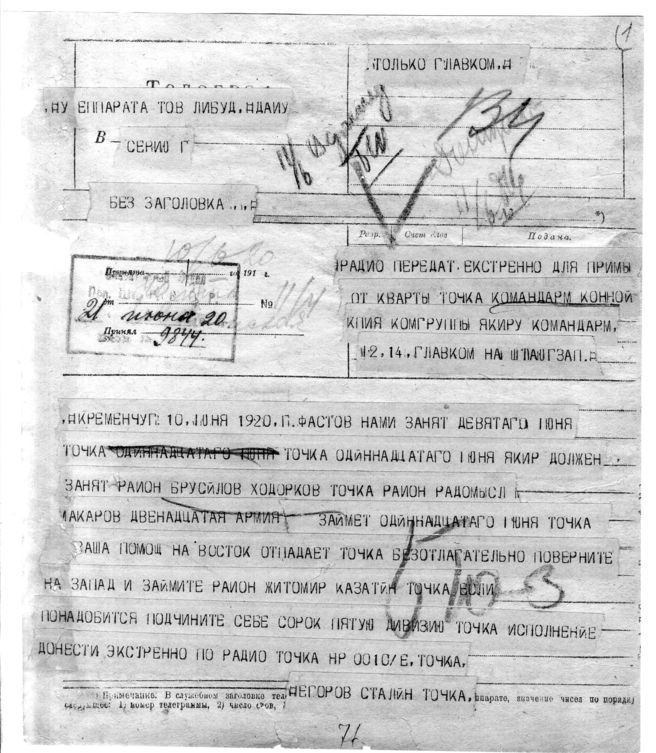 Телеграмма № 0010/с командарму Конной, копии комгруппы Якиру, командармам 12, 14, Главкому, начальнику штаба Юго-Западного фронта с сообщением о занятии 9 июня Фастова, о предстоящем занятии группой Якира района Брусилов–Ходорков и 12 армией – района Радо