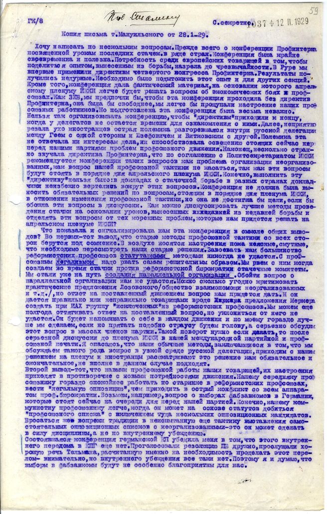 док.21: Копия письма Мануильского Д.З. о конференции Профинтерна, о пленуме ЦК КПГ и по другим вопросам.