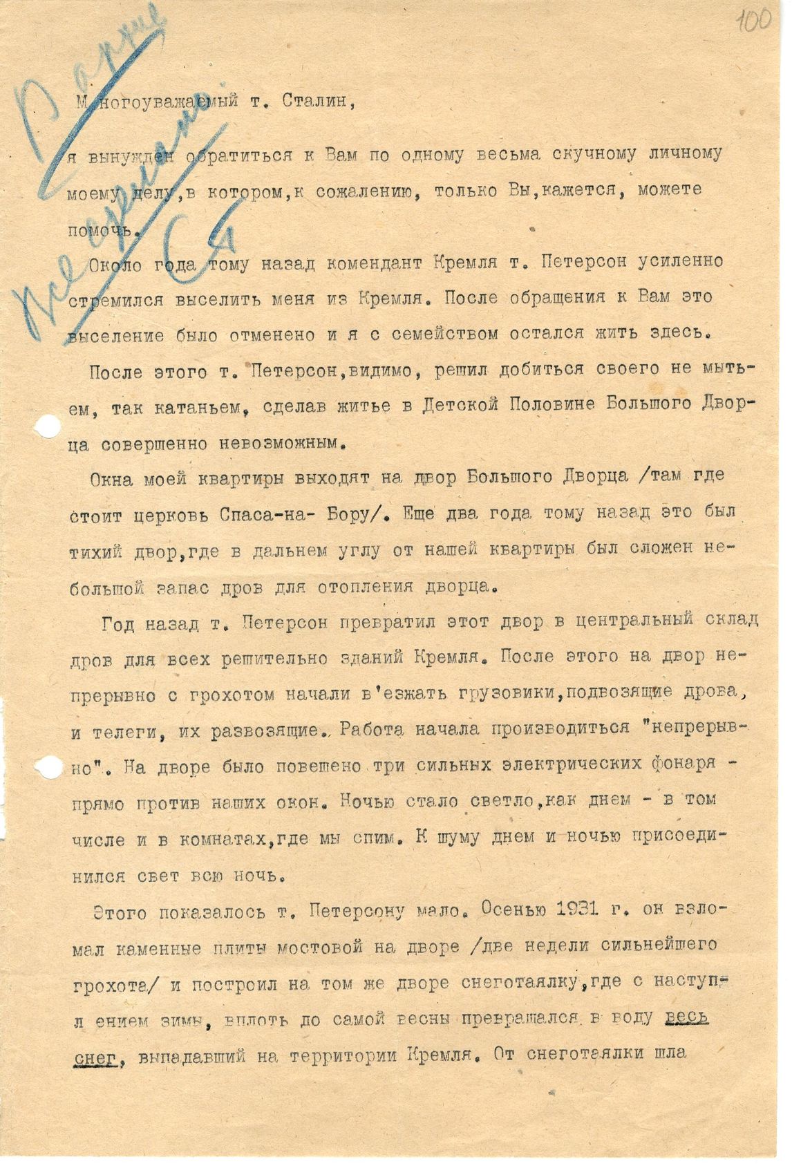 док.23: Письмо Осинского В.В. о создании условий для работы в Кремле с резолюцией Сталина И.В.