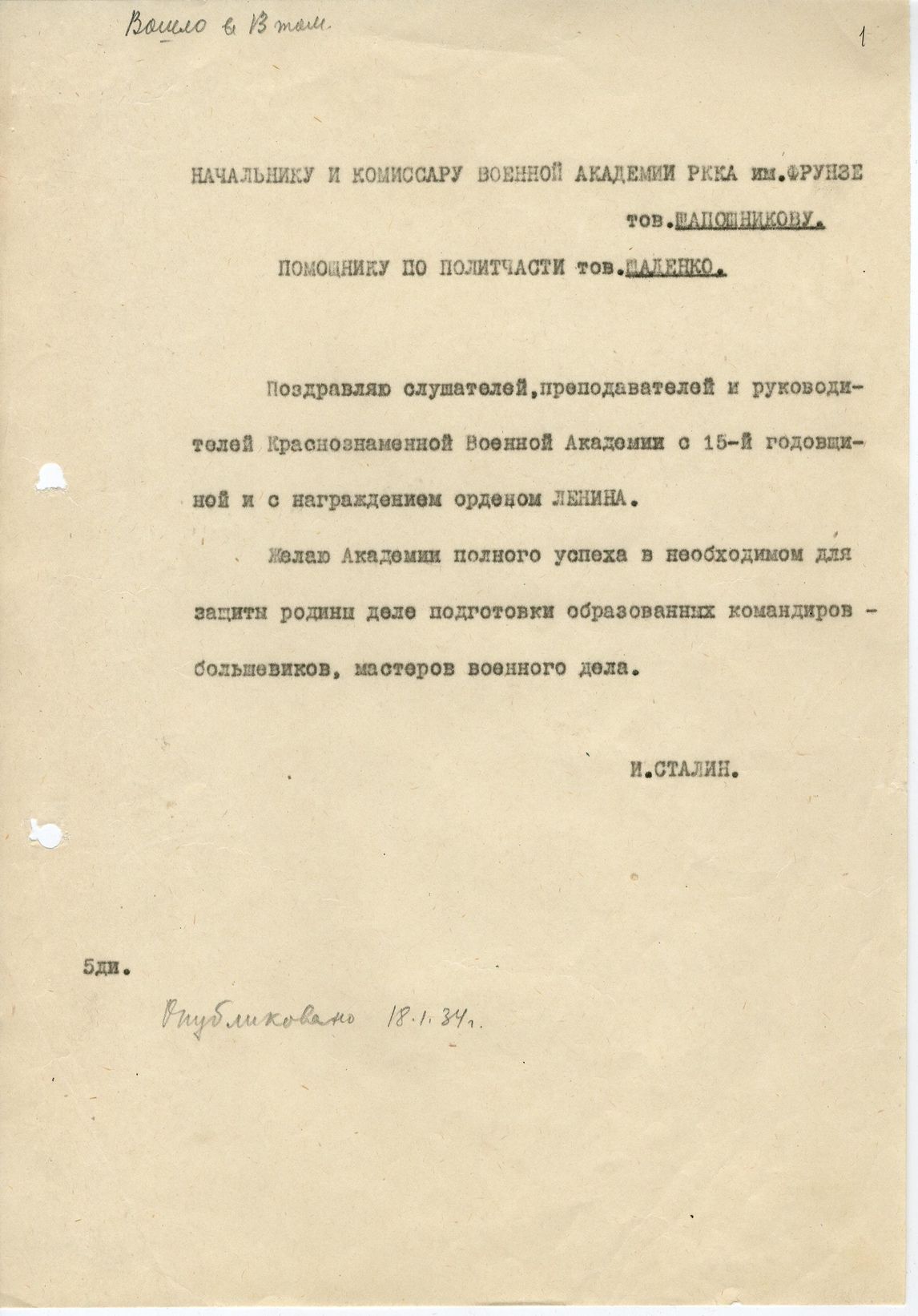 док.1: Приветствие Сталина И.В. начальнику и комиссару Военной академии РККА им.Фрунзе Шапошникову Б.М., помощнику по политчасти Щаденко Е.А.