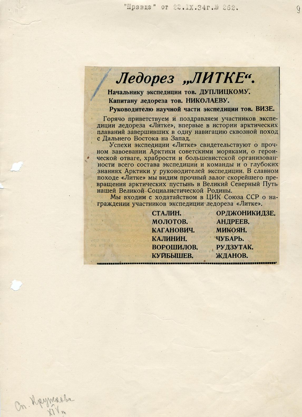 док.8: Приветствие Сталина И.В., Молотова В.М., Кагановича Л.М. и др. ледорезу "Литке".