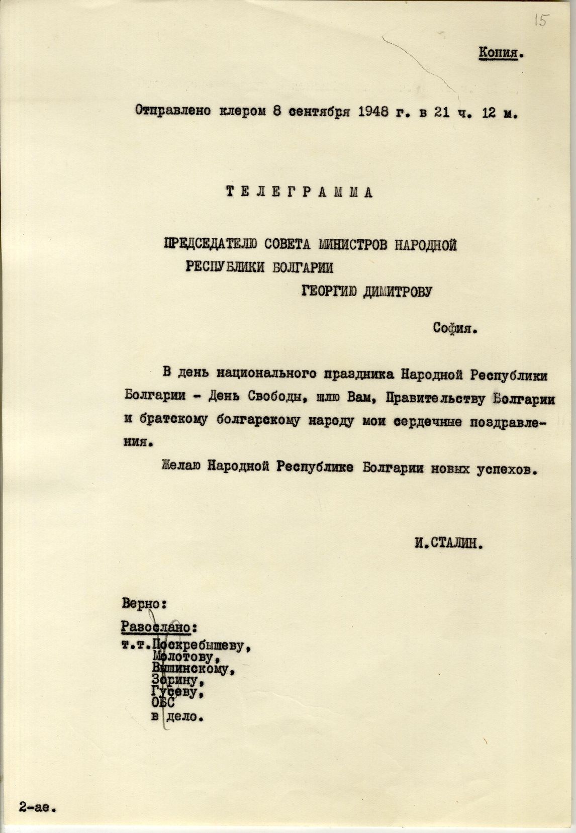 док.15: Приветствие Сталина И.В. председателю СМ НР Болгарии Г.Димитрову п случаю национального праздника Болгарии.
