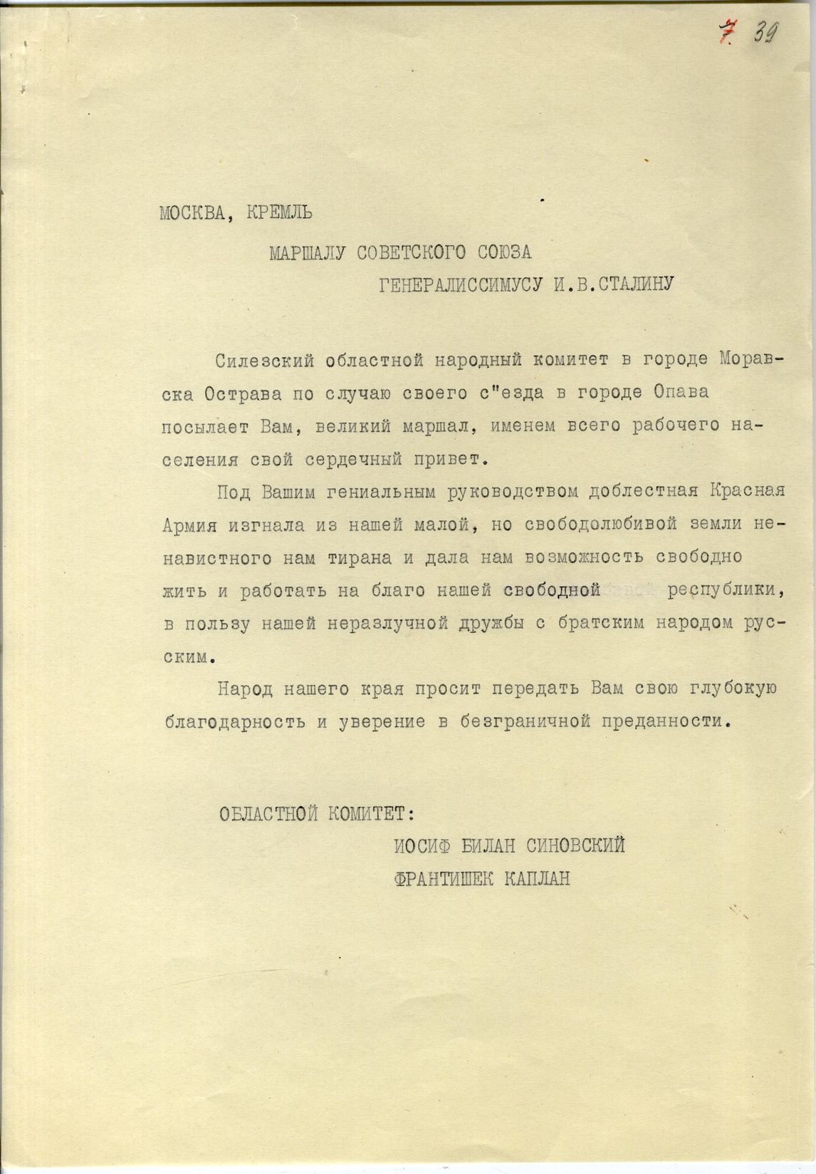 док.11: Телеграмма Иосифа Билан Синовского и Франтишека Каплана из Моравской Остравы (Чехословакия) Сталину И.В. с приветствием от имени съезда Силезского областного народного комитета.