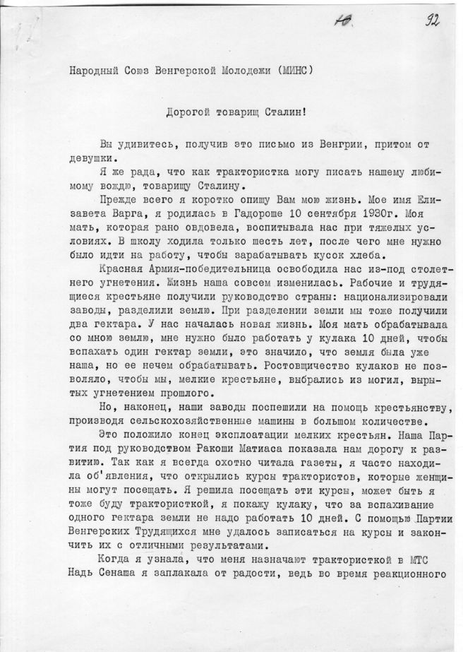 док.22: Письмо венгерской трактористка Варга Е. Сталину И.В.