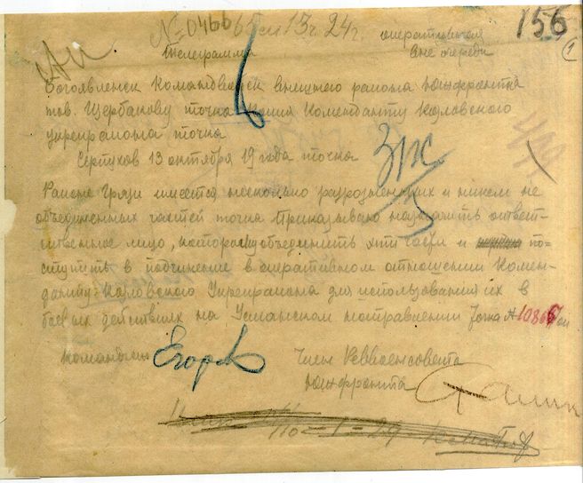 Телеграмма РВС Южного фронта Щербакову и коменданту Козловского укрепленного района