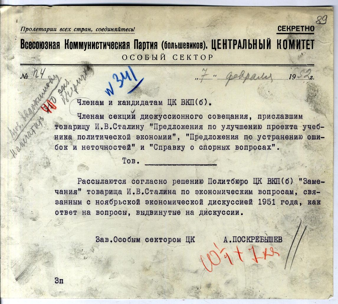 док.3: Справка Особого сектора ЦК ВКП(б) (Поскребышева) о рассылке членам и кандидатам ЦК ВКП(б), членам секций дискуссионного совещания по работе Сталина И.В. "Замечания по экономическим вопросам, связанным с ноябрьской дискуссией 1951 года".