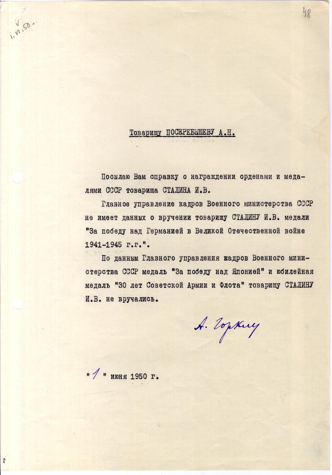 док.28: Записка Горкина А. Поскребышеву А.Н. с приложением справки о награждении орденами и медалями СССР Сталина И.В.