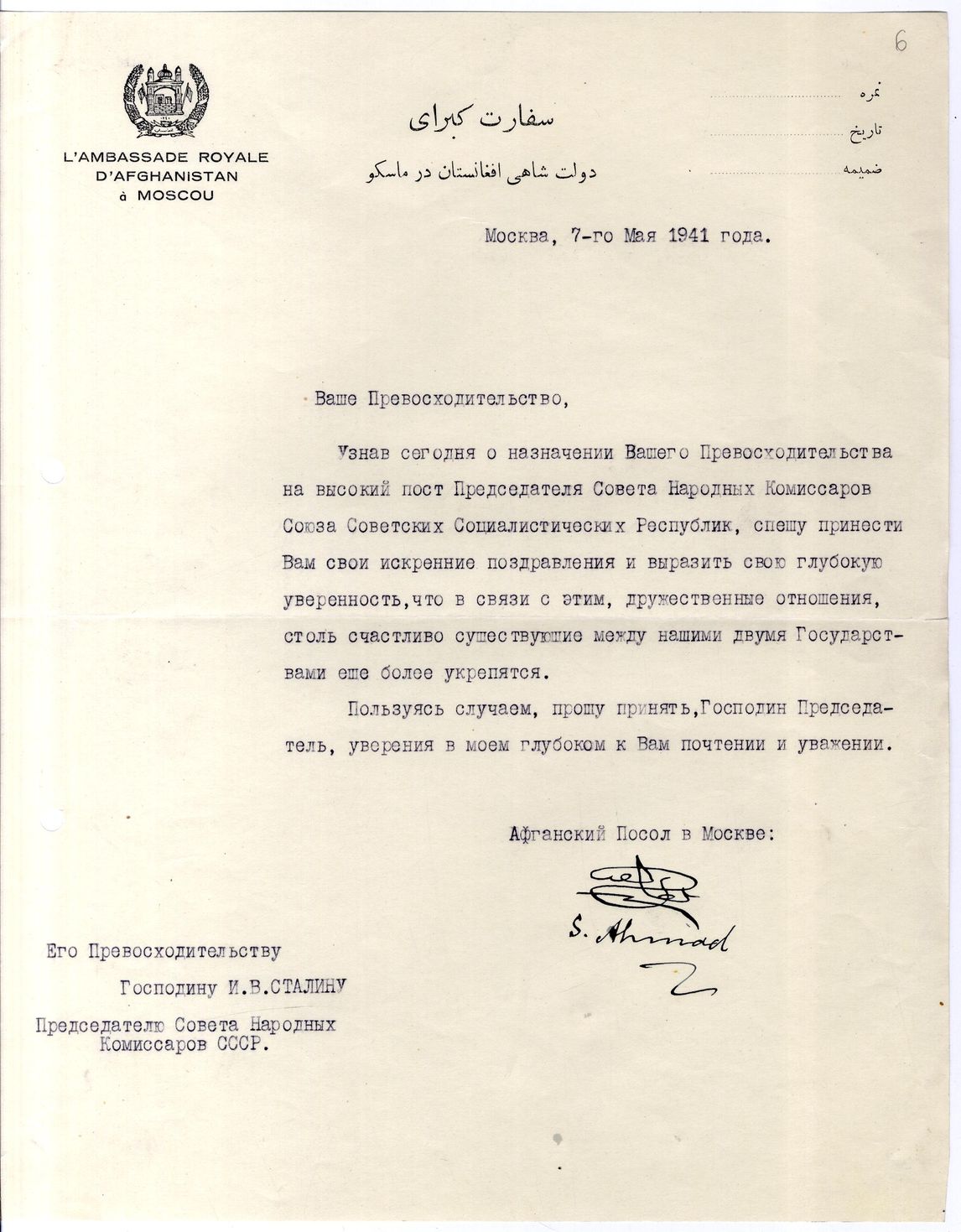 док.5: Поздравительное письмо от афганского посла в Москве Султан Ахмед Хана в связи с назначением Сталина И.В. Председателем СНК СССР.