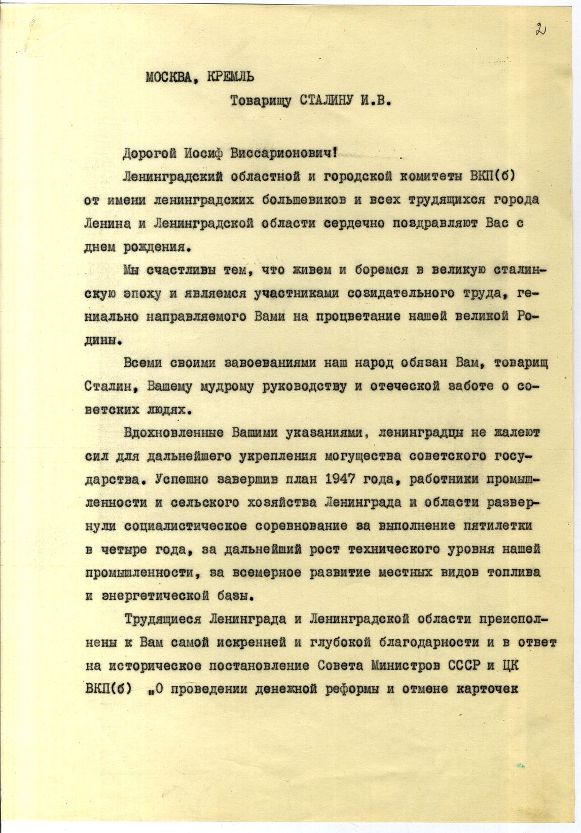 док.2: Приветственное письмо Лениградского областного и городского комитетов ВКП(б) Сталину И.В. в связи с его 68-летием.