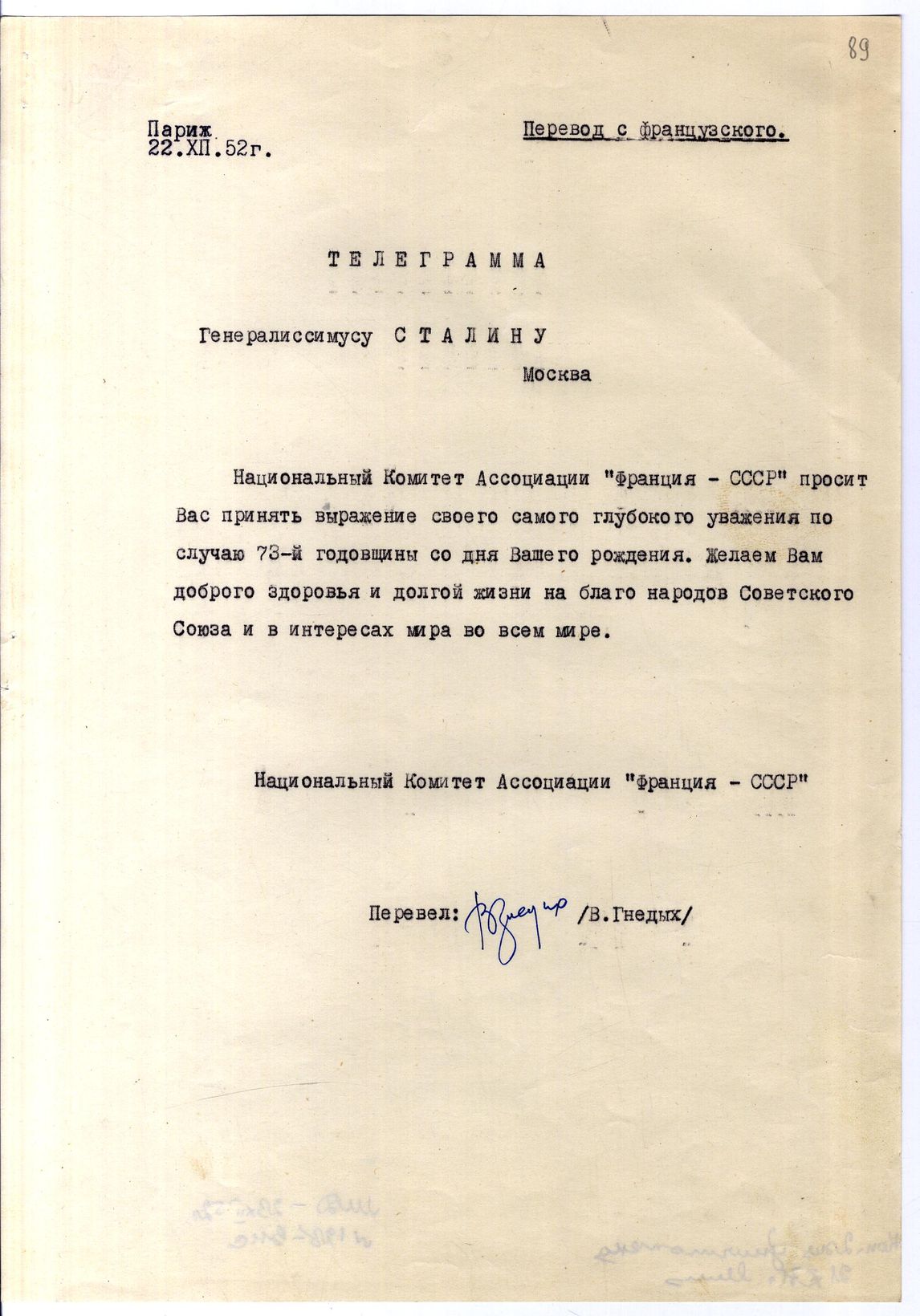 док.32: Приветственная телеграмма ЦК Национального комитета Ассоциации "Франция-СССР" Сталину И.В. по случаю 73-летия Сталина И.В.