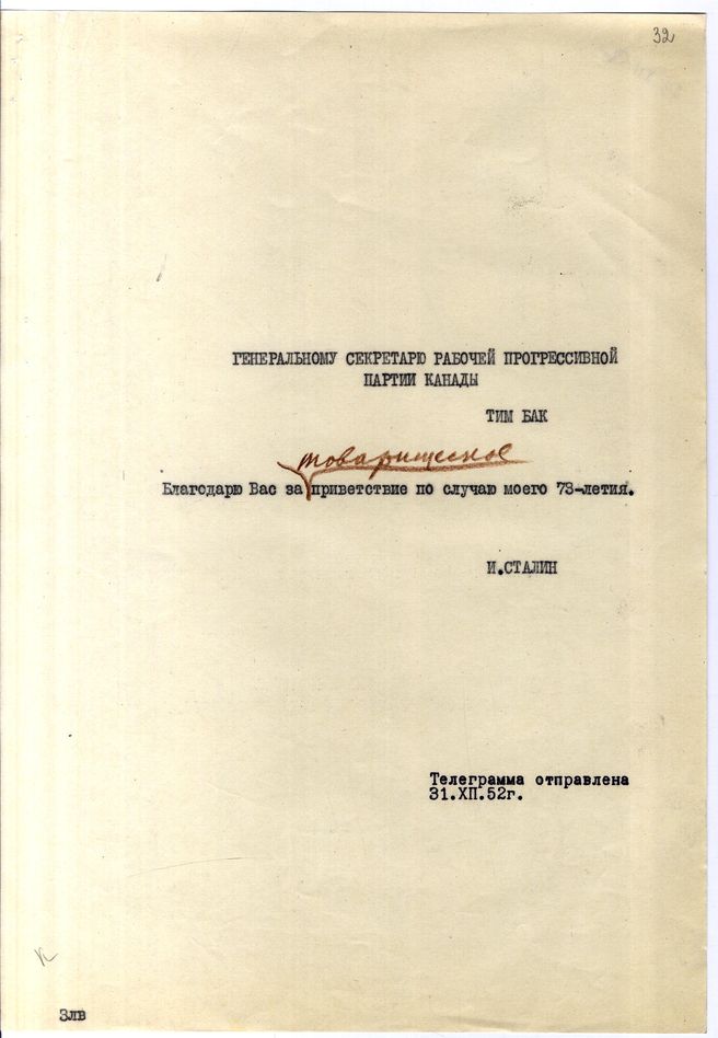 док.12: Телеграмма Сталина И.В. генеральному секретарю РПП Канады Тиму Баку с благодарностью за товарищеские привествия по случаю 73-летия Сталина И.В.