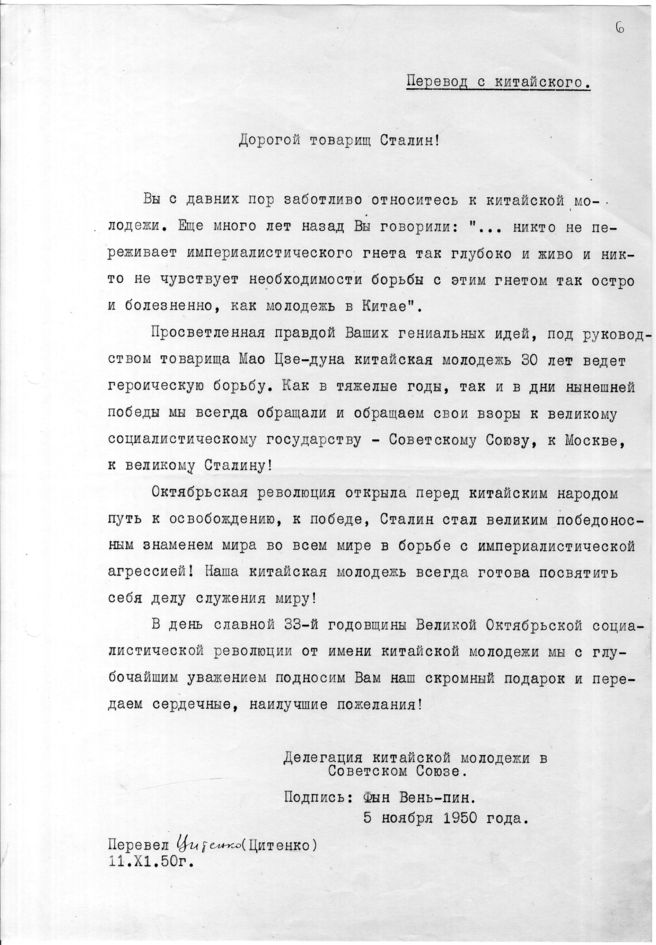 док.5: Приветственное письмо делегации китайской молодежи в Советском Союзе Сталину И.В.