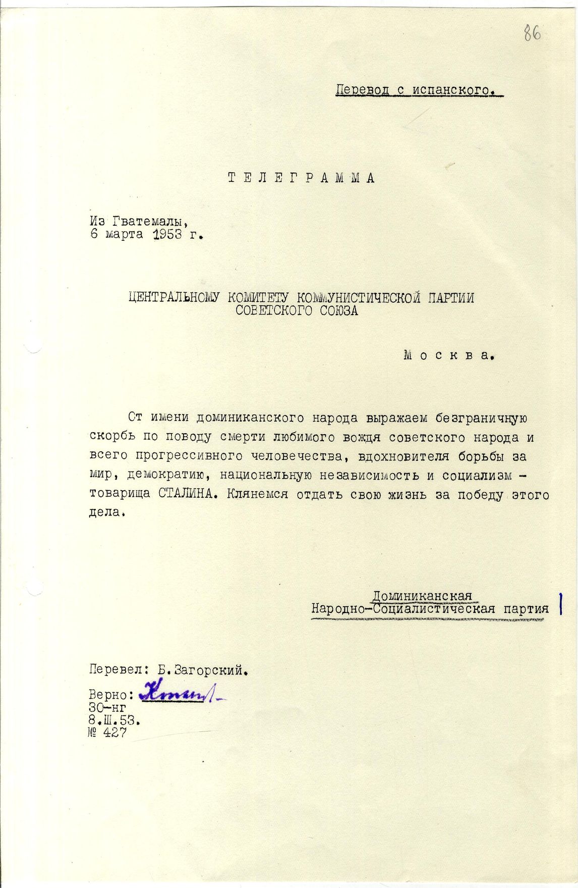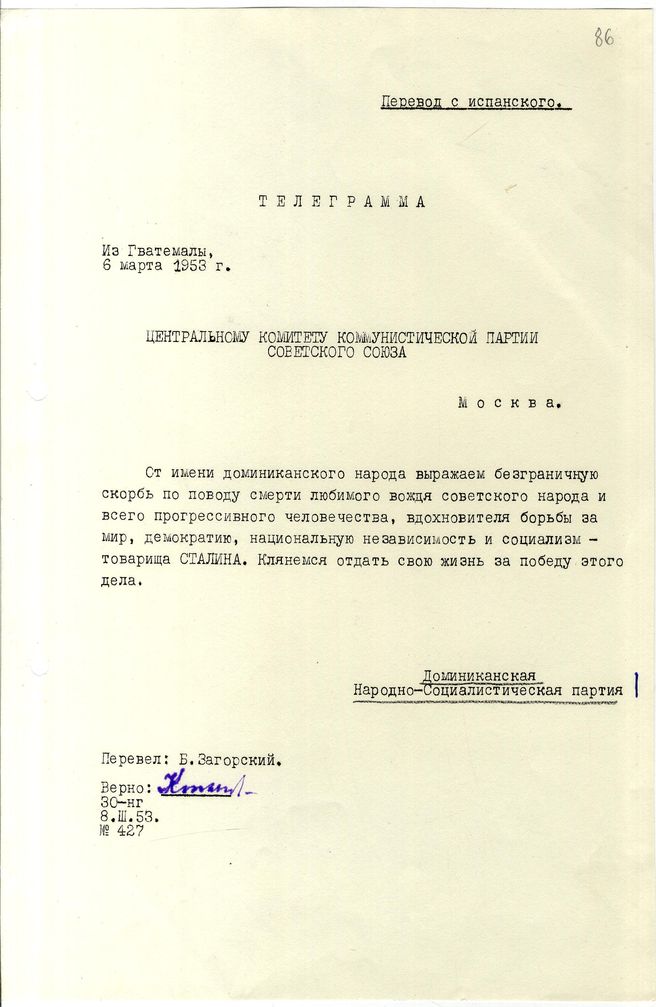 док.35: Телеграмма Доминиканской Народной социалистической партии из Гватемалы в адрес ЦК КПСС с соболезнованиями в связи со смертью Сталина И.В.