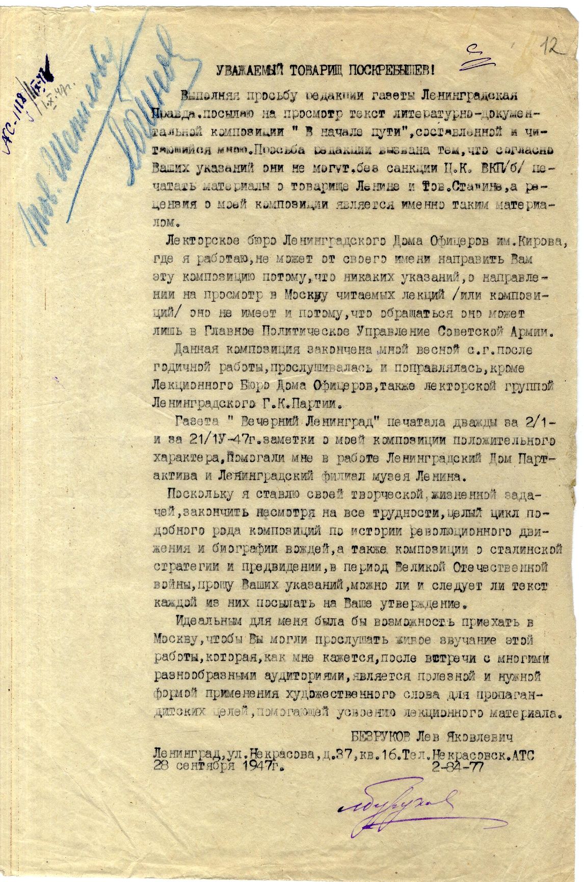 док.2а: Письмо Безрукова Л. с приложением литературно-документальной комозиции "В начале пути".