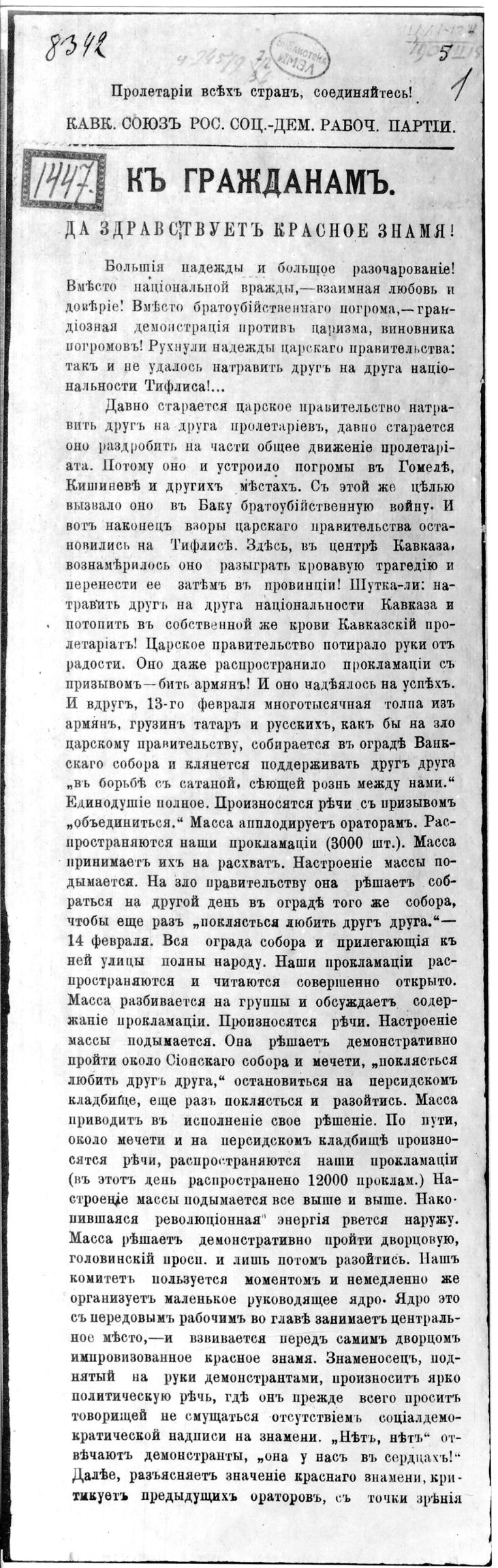 Прокламация Сталина И.В. (на русском и грузинском языках) «К гражданам. Да здравствует Красное знамя».
