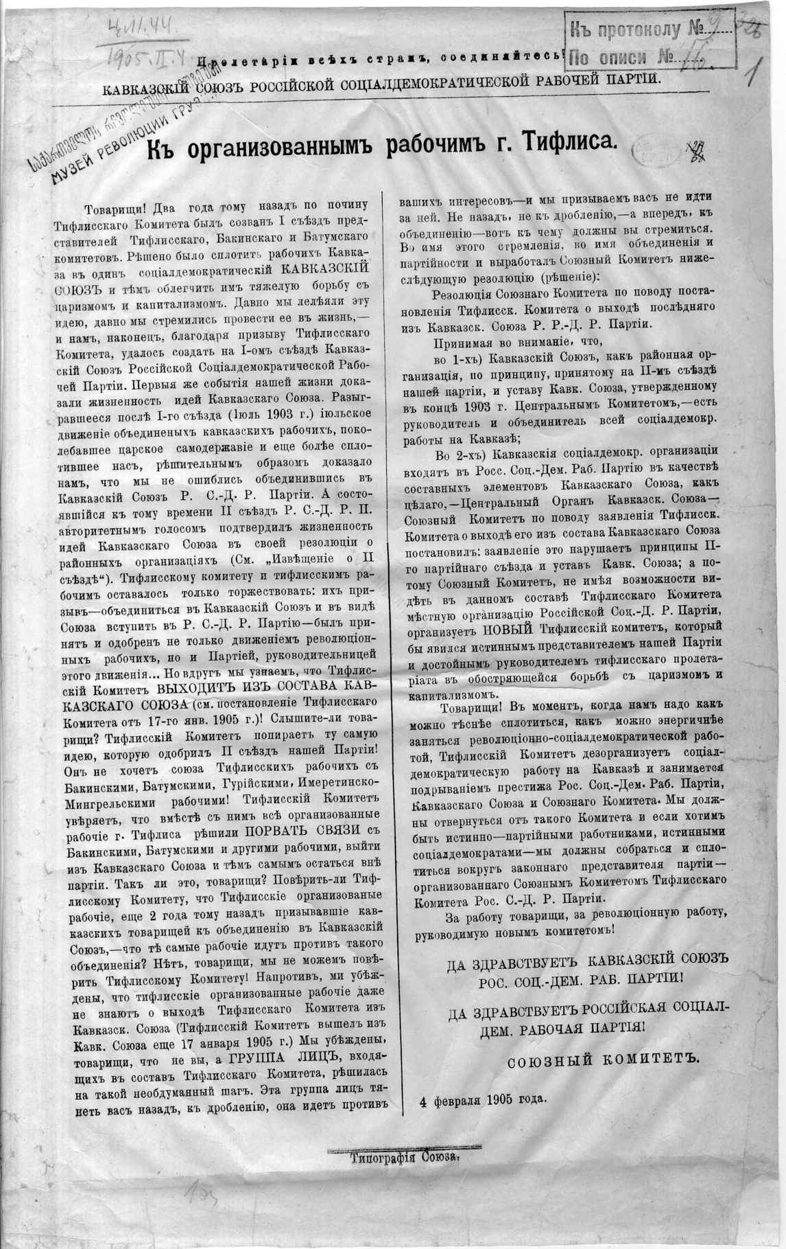Прокламация Сталина И.В. (на русском и грузинском языках) «К организованным рабочим г. Тифлиса. Товарищи! Два года тому назад по почину тифлисского Комитета…».