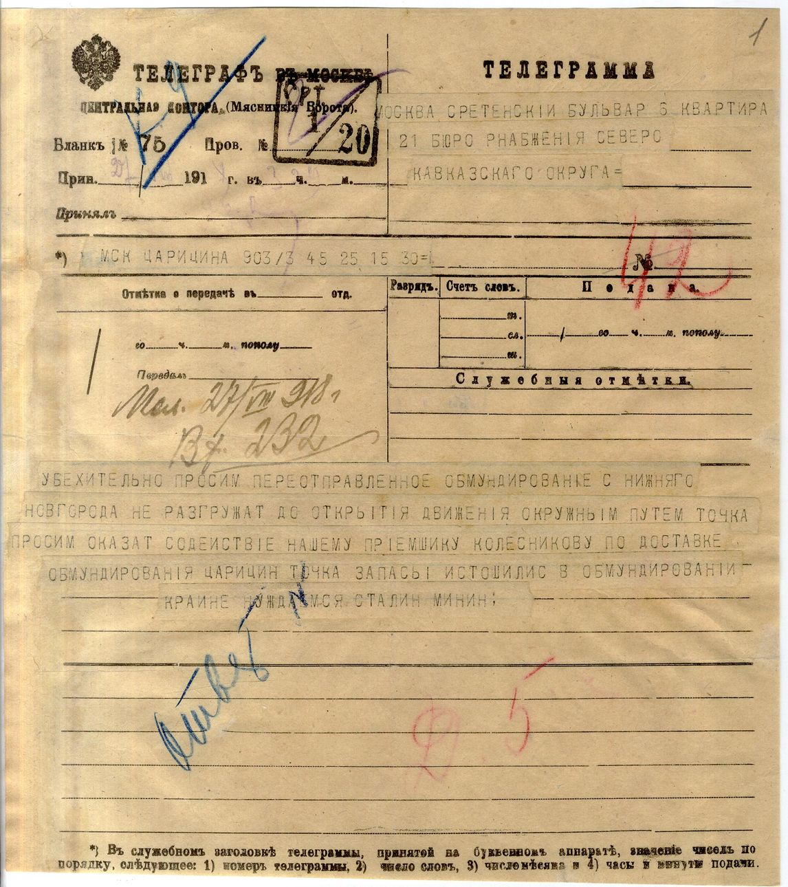 Телеграмма в Москву, в бюро снабжения Северокавказского округа с просьбой переотправленное обмундирование из Нижнего Новгорода не разгружать до открытия движения окружным путем и оказать содействие приемщику Колесникову по доставке обмундирования в Царицы