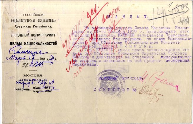 Мандат № 2315, выданный Наркоматом по делам национальностей за подписью Сталина И.В. Куджиеву В.М., как представителю Наркомнаца при областном исполнительном комитете Карельской Трудовой Коммуны.