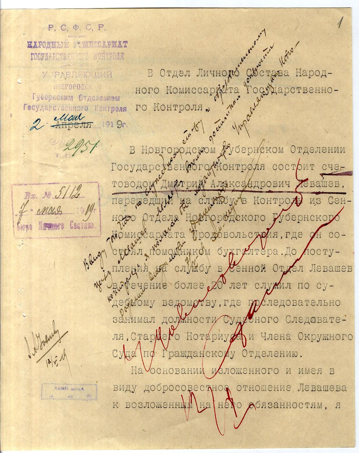 Письмо управляющего Новгородским отделением Государственного контроля в Наркомат госконтроля с ходатайством о назначении счетовода Левашова Д.А. контролером, с резолюцией Сталина И.В. 2 мая 1919 г.