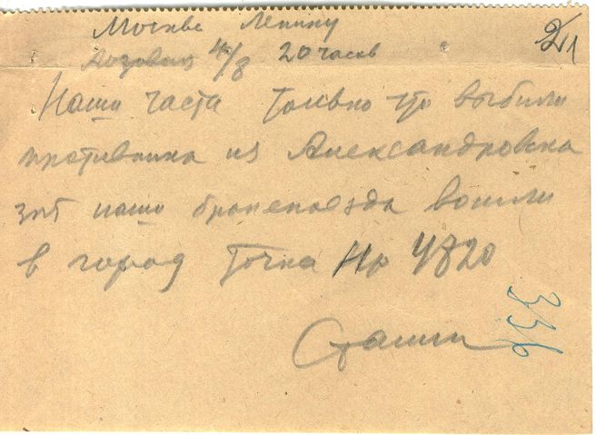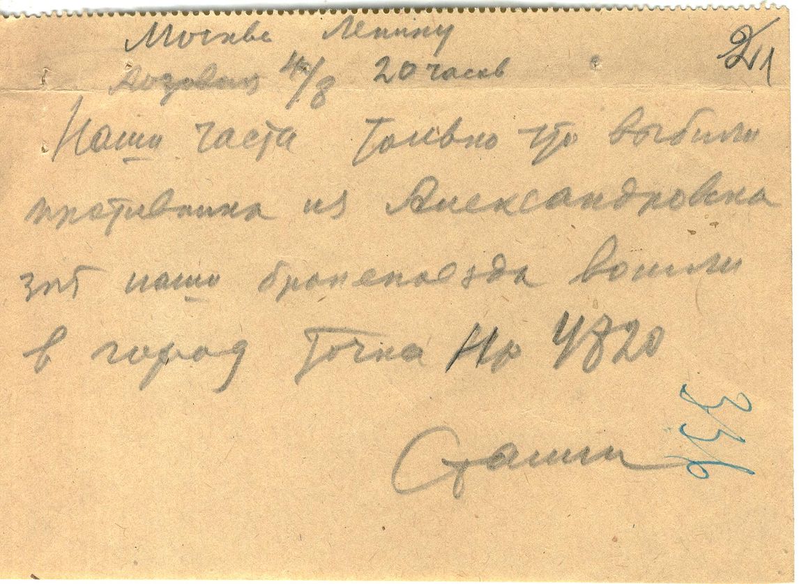 | Аннотация | Телеграмма (№ 4820) Сталина И.В. Ленину В.И. об освобождении Александровска. |