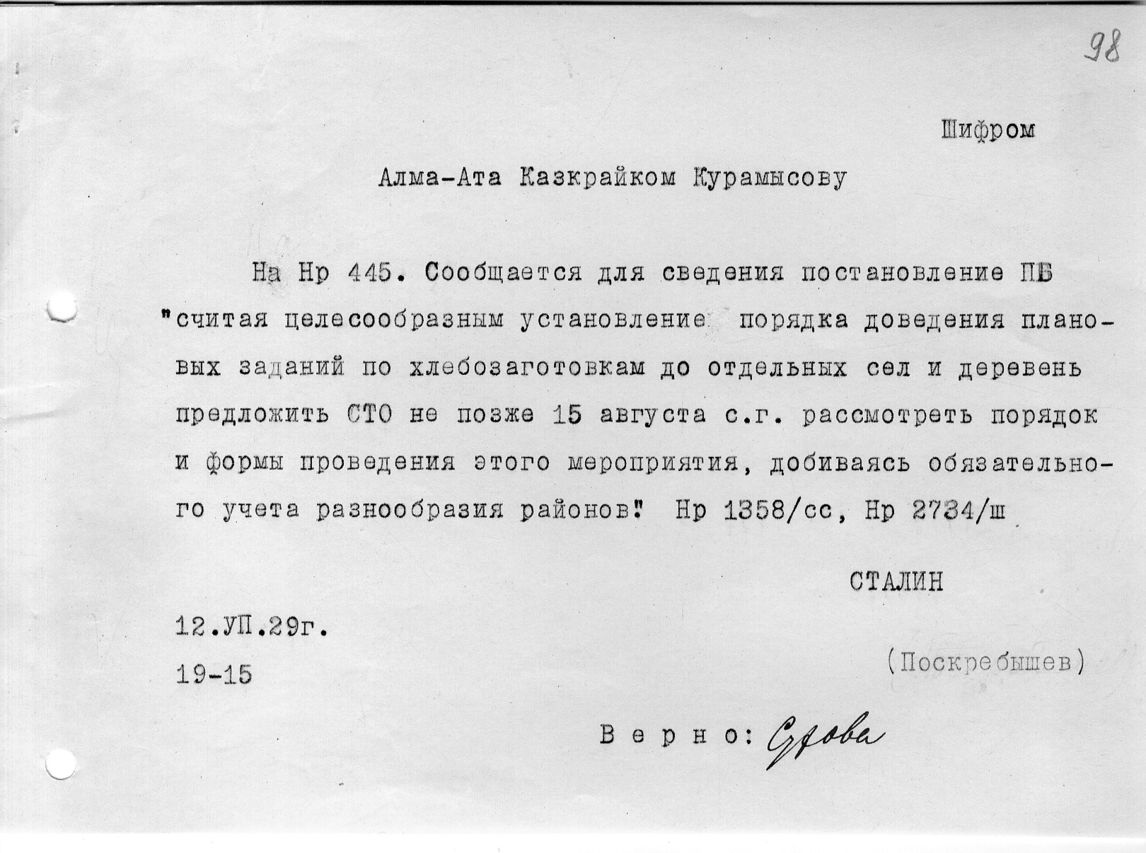 док.51: Шифротелеграмма Сталина И.В. в Алма-Ату Курамысову с текстом постановления Политбюро ЦК об установлении порядка доведения плановых заданий по хлебозаготовкам до отдельных сел и деревень.