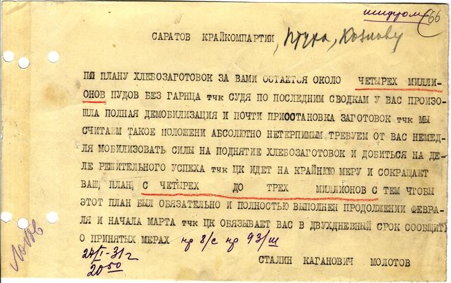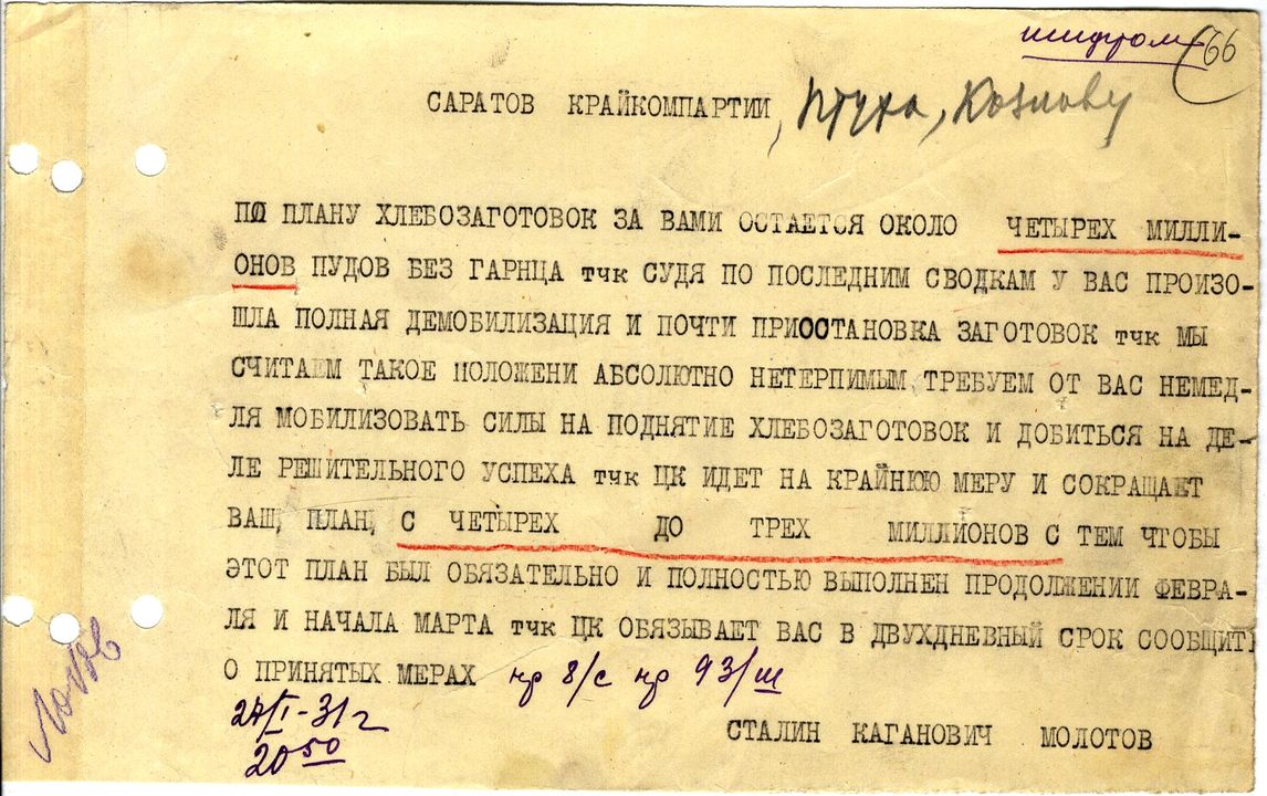 док.33: Шифротелеграмма Сталина И.В., Кагановича Л.М. и Молотова В.М. в Саратов Птухе В.В. и Козлову о выполнении плана хлебозаготовок.