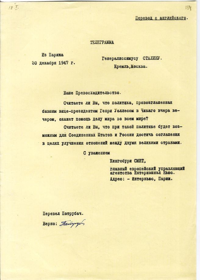 док.77: Телеграмма из Парижа от генерального директора агентства "Интернешнл ньюс сервис" Смита на имя Сталина И.В. с просьбой ответить на вопрос об улучшении советско-американских отношений.