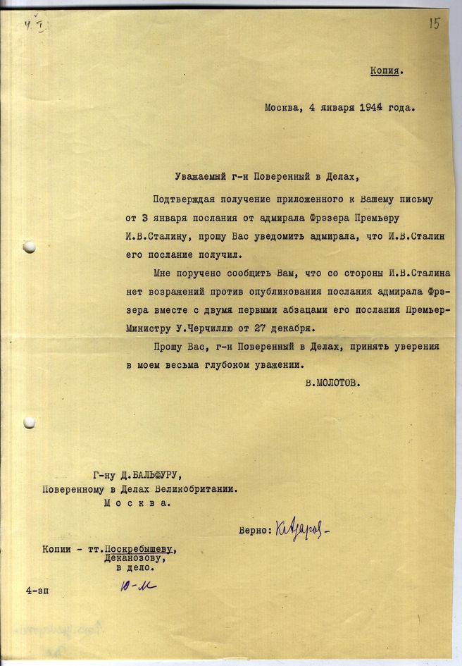 док.4а: Письмо Молотова В.М. Бальфуру Д. о подтверждении получения письма от 3 января.