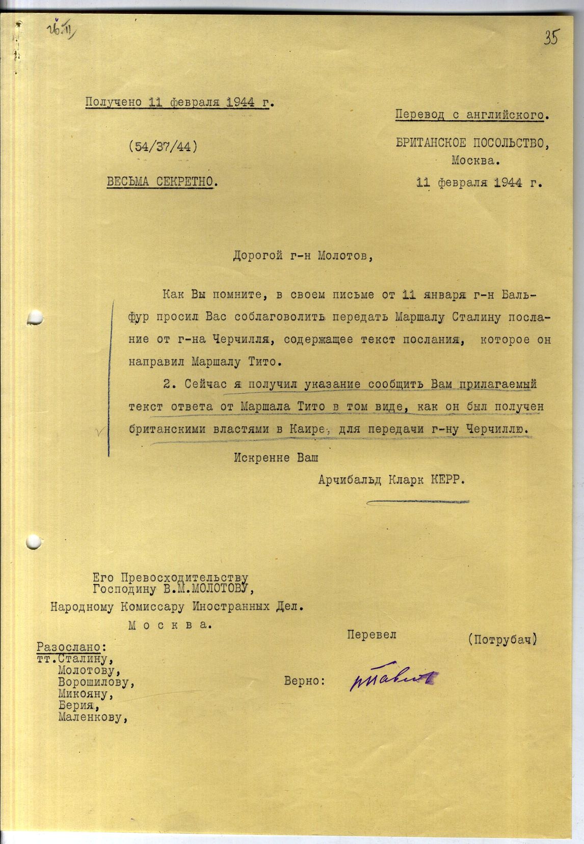 док.5: Письмо Керра А. Молотову В.М. с текстом ответа Тито И.Б. на послание Черчилля У.