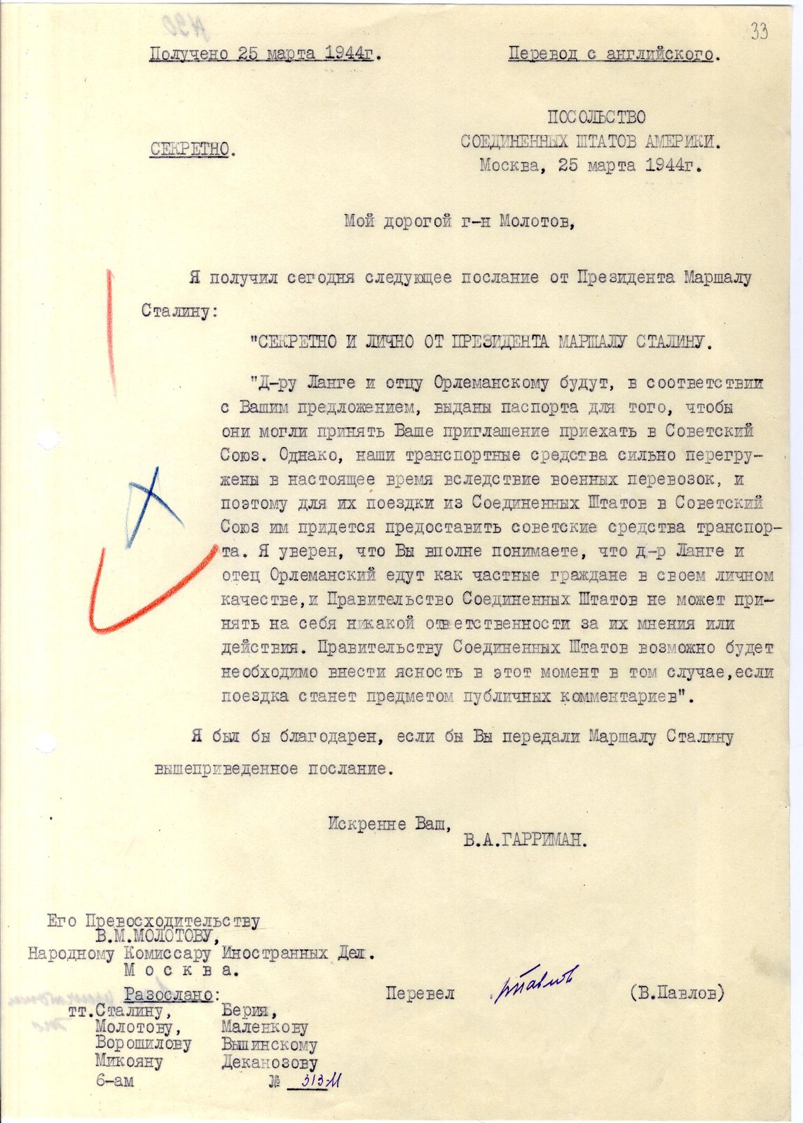 док.11: Письмо Гарримана А. Молотову В.М. с текстом послания Рузвельта Ф. Сталину И.В. о поездке Ланге и Орлеманьского в СССР.