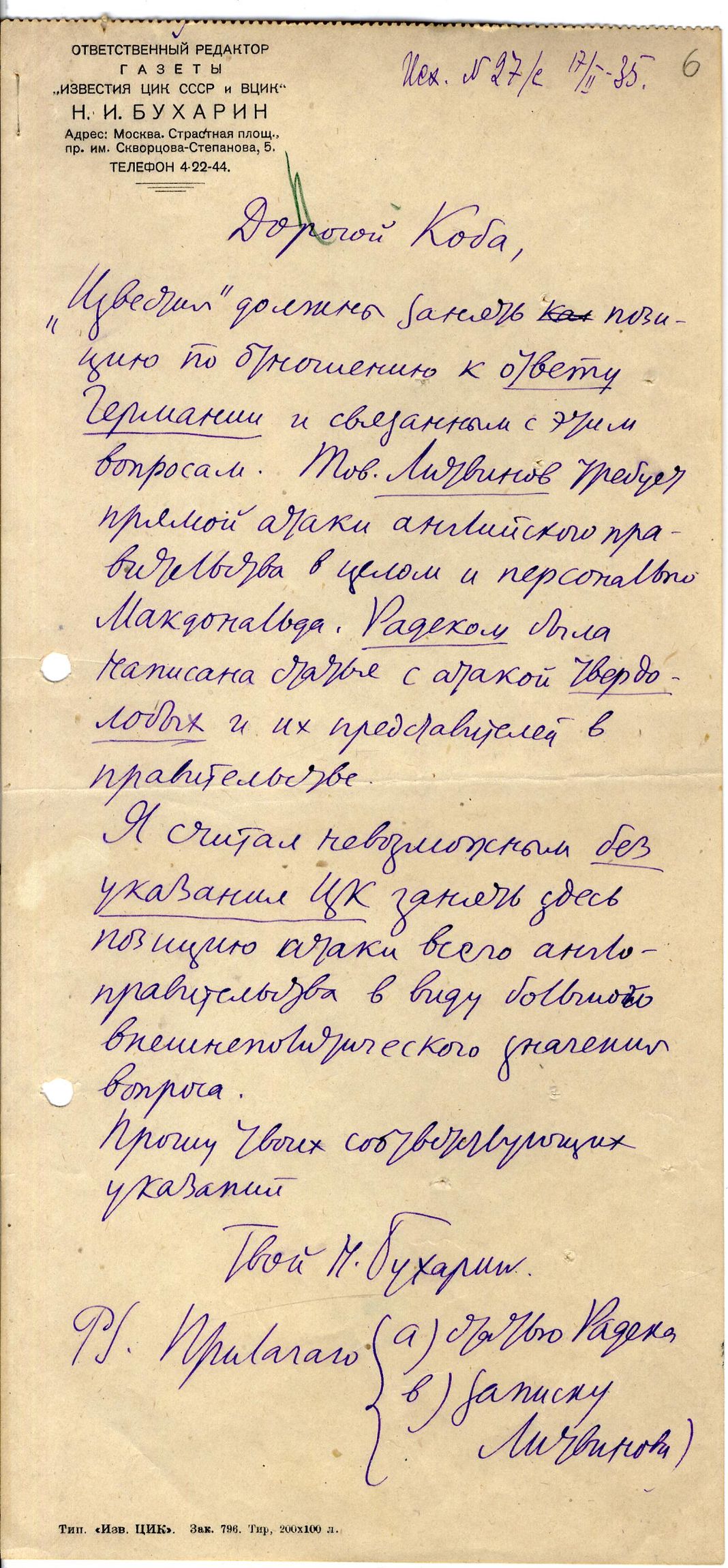 док.4: Письмо Бухарина Н.И. Сталину И.В. о позиции и освещении в "Известиях" германского ответа на англо-французское коммюнике, с резолюцией Сталина И.В. и приложением записки Литвинова М.М. и статьи Радека по этому вопросу.