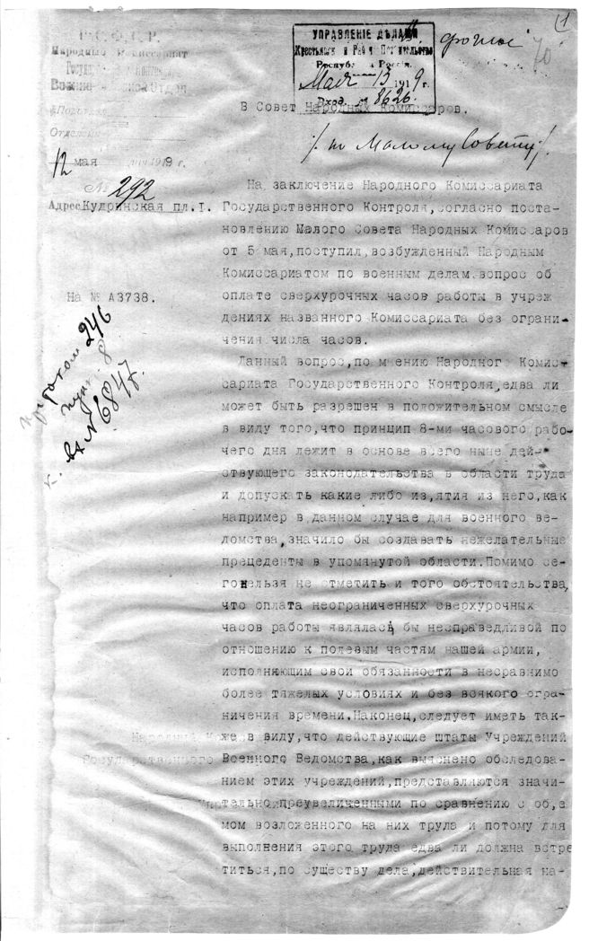 | Аннотация | Письмо № 292 Народного комиссариата государственного контроля в Малый Совет Народных Комиссаров с заключением по вопросу об оплате сверхурочных часов работы в учреждениях Народного Комиссариата по военным делам. Подпись: Сталин. 12 мая 1919 г. Москва. |