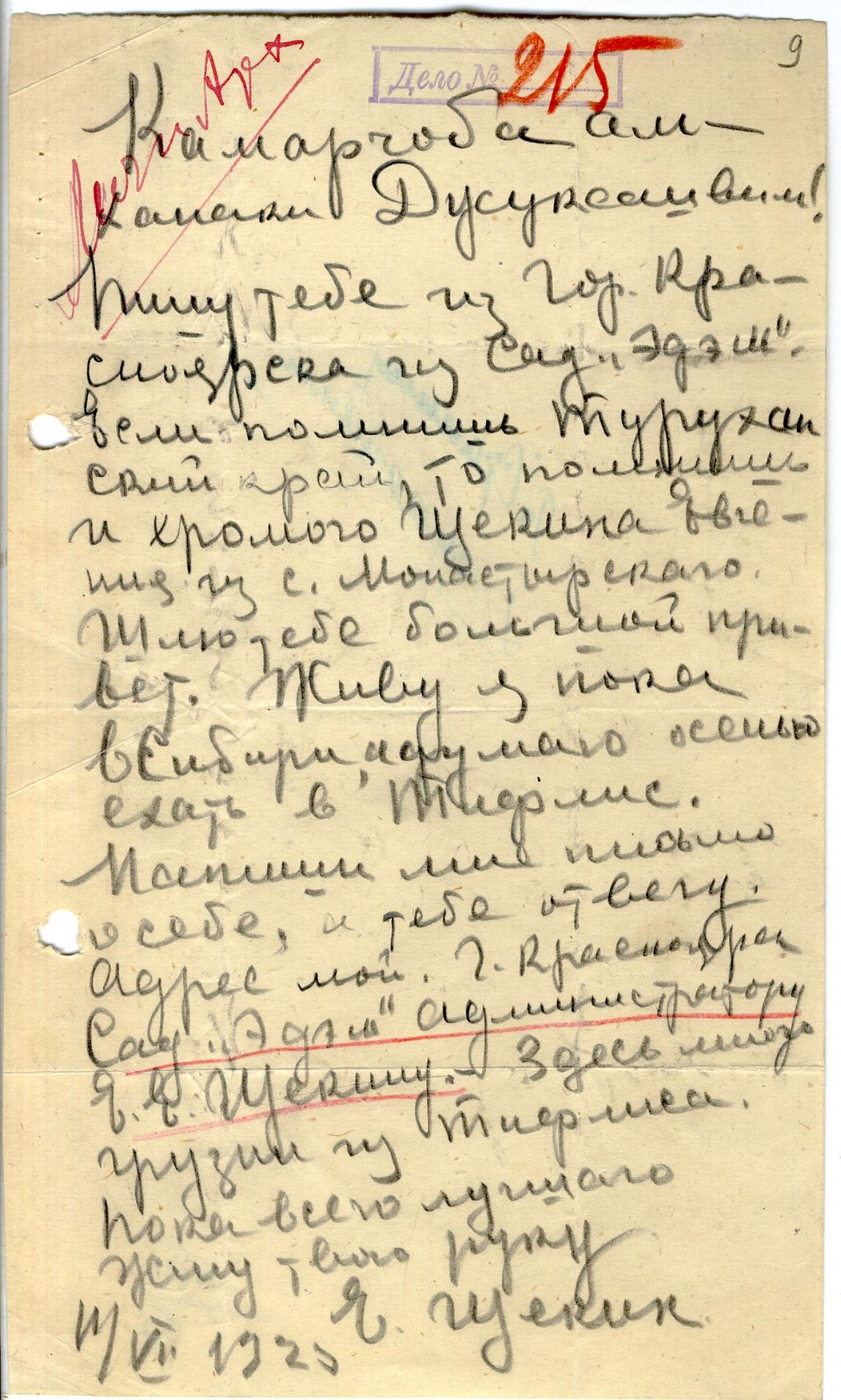 док.7: Письмо Щекина Е.Е. с просьбой написать ему письмо.