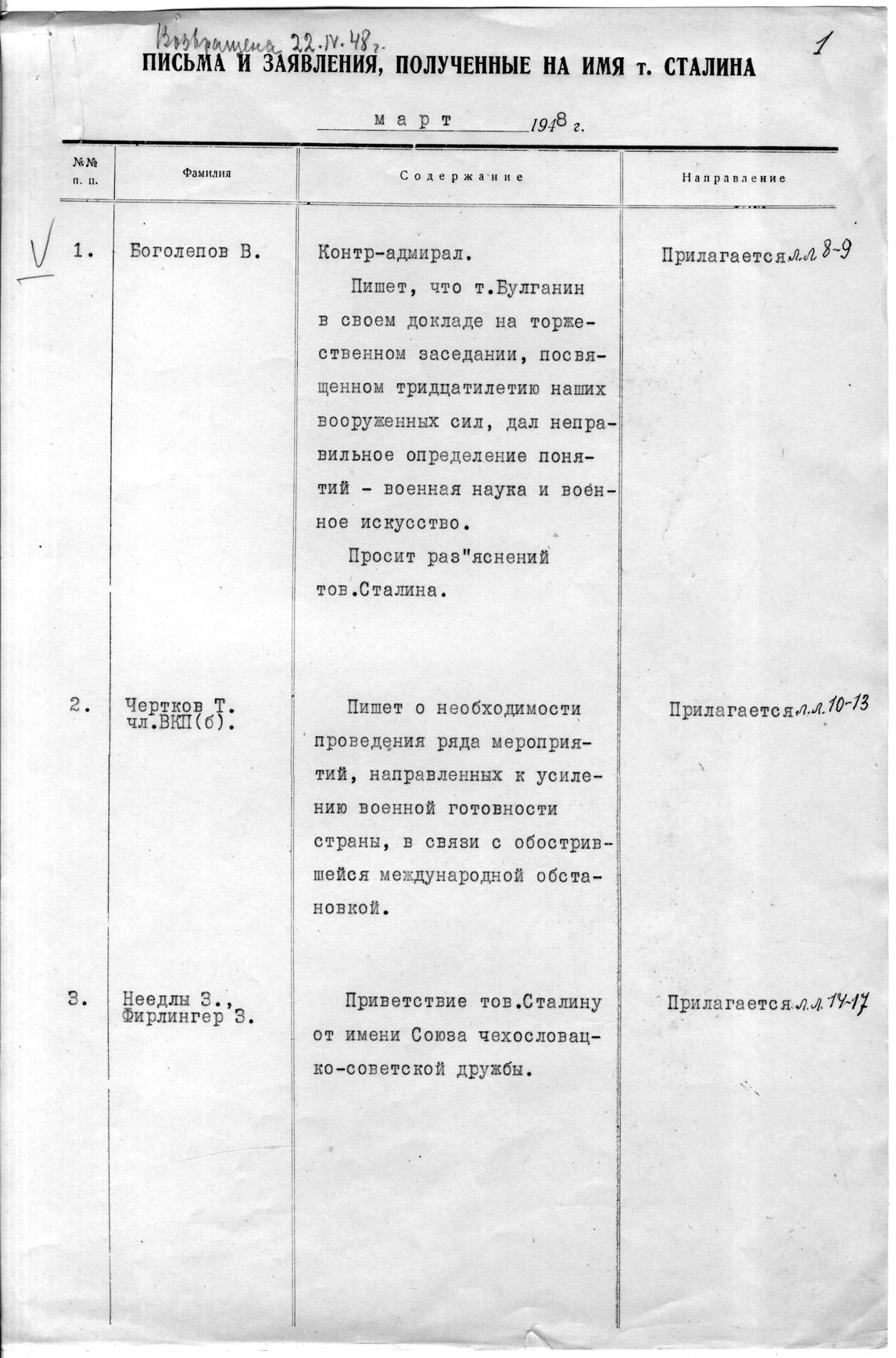 док.1: Сводка на письма и заявления, полученные на имя Сталина И.В.