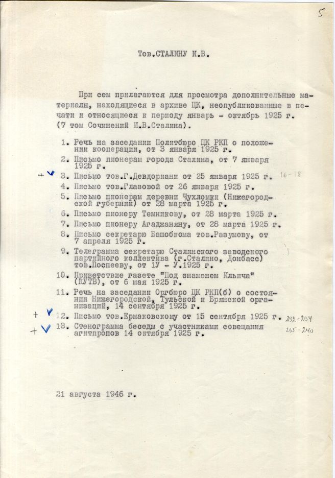 док.4: Список дополнительных материалов для 7 тома Собрания Сочинений Сталина И.В.