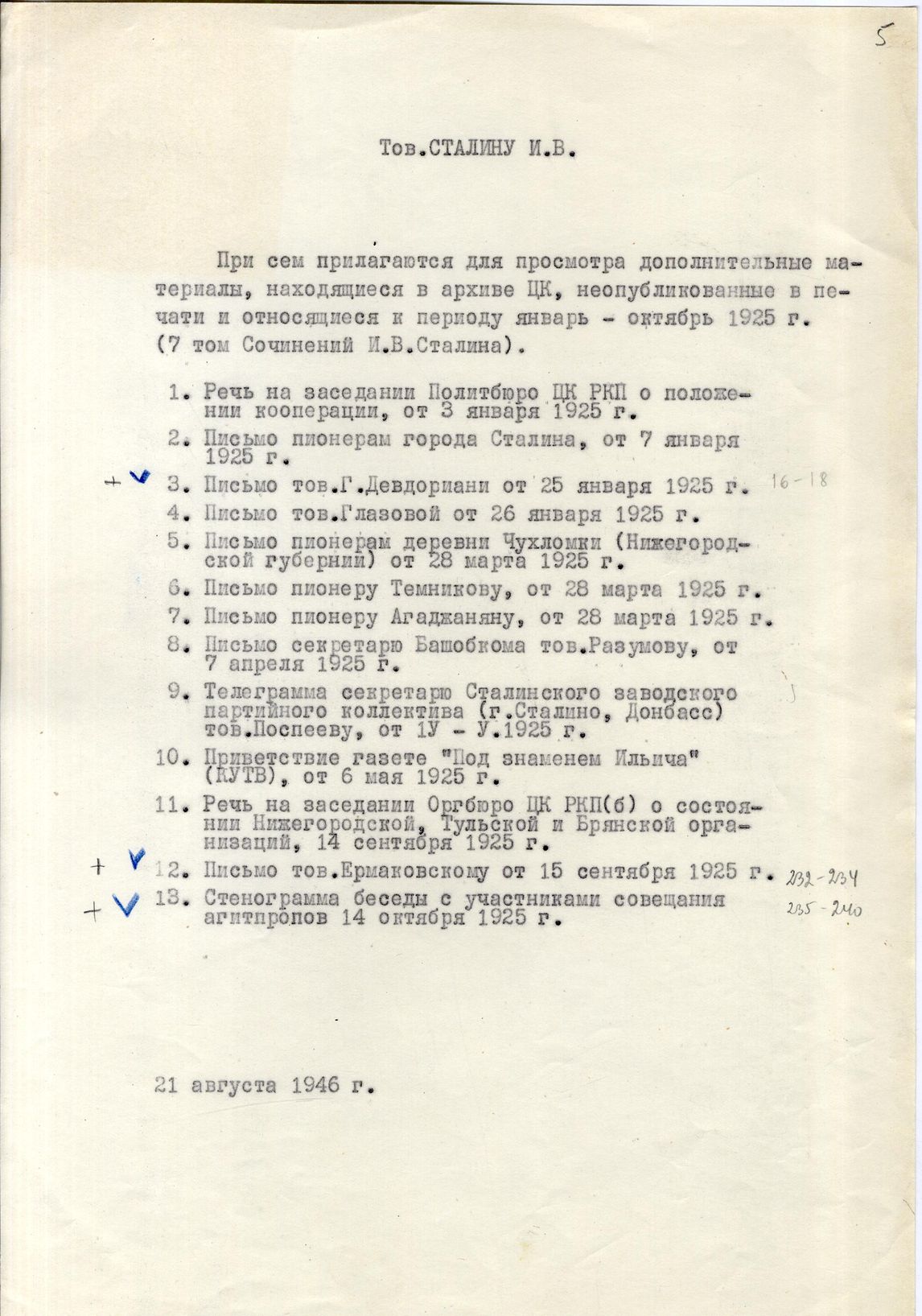 док.4: Список дополнительных материалов, находящихся в архиве ЦК, неопубликованных в печати и относящихся к периоду январь-октябрь 1925 г.