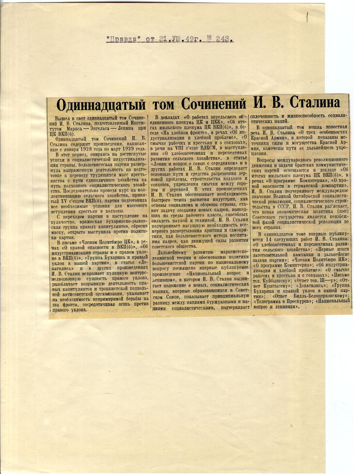 док.1: Вырезка из газеты "Правда" - "Одиннадцатый том Сочинений Сталина И.В."