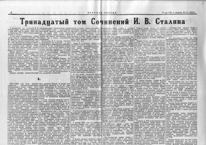 док.2: Вырезка из газеты "Красная звезда" - "Тринадцатый том Сочинений И.В.Сталина" (Рецензия профессора Волкова И.).