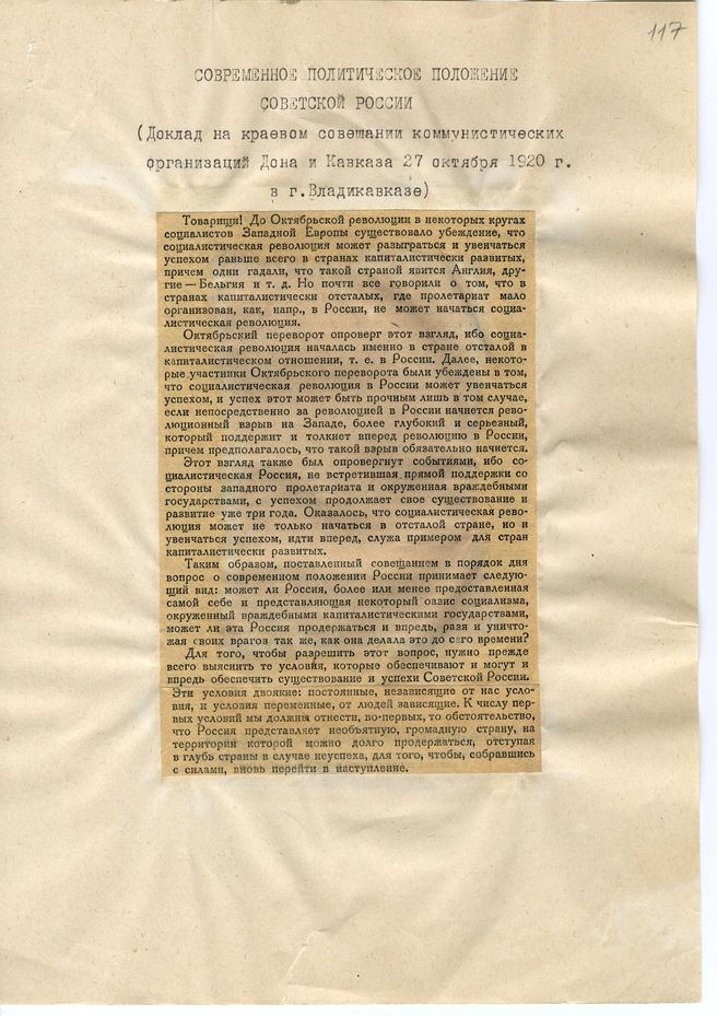 док.78: : Доклад на краевом совещании коммунистических организаций Дона и Кавказа "Современное политическое положение Советской России".